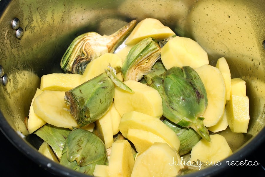 Añadimos las patatas troceadas y las alcachofas y sofreímos.