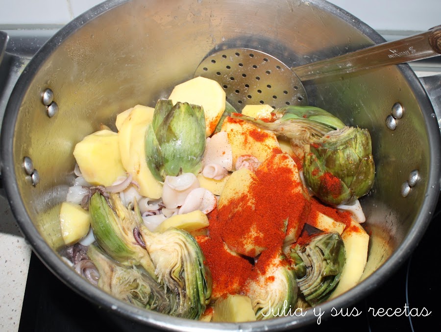 Después añadimos los calamares, el pimentón , el perejil y una poquita sal.