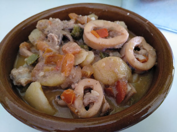 Subir el fuego y añadir el calamar, rehogar dos minutos.