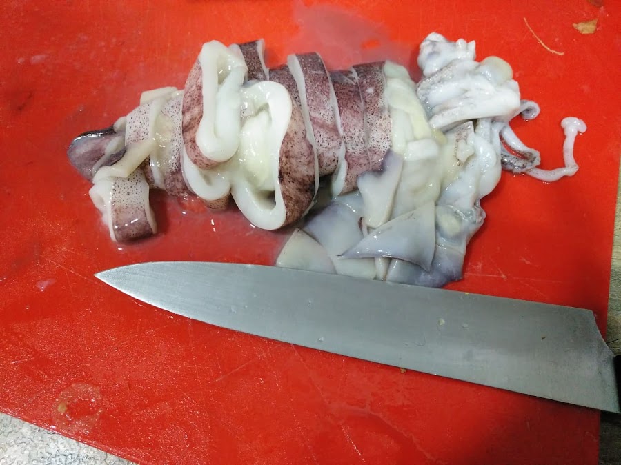 Mientras se cocina, limpiar el calamar y trocearlo (la tinta no la usaremos).