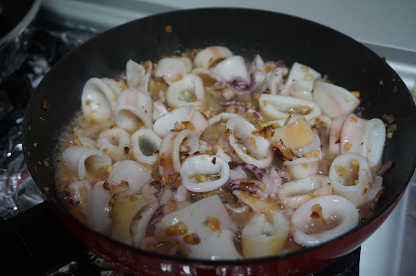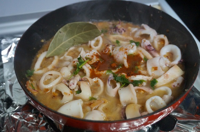 Lo rehogamos un minuto y echaremos los calamares, lo dejamos cocinar unos minutos, removiéndolo.