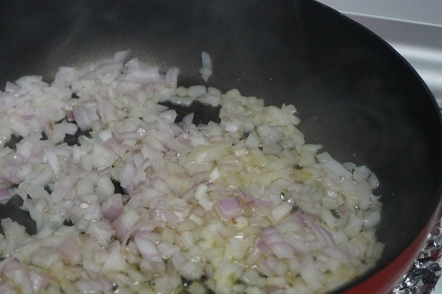 Picaremos la cebolla y el ajo, lo pondremos a pochar en una sartén con un poquito de aceite,