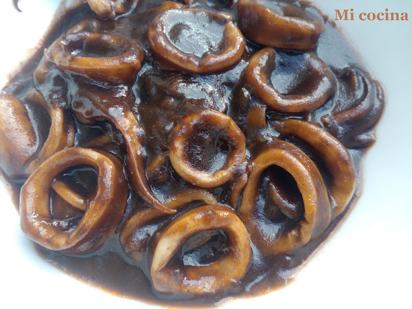 1/2 kg. de calamares, 1/2 cebolla grande (blanca, dulce, tipo cebolleta), medio vaso de tomate frito, medio vaso pequeño de coñac, un vaso de caldo de pescado, una cucharada pequeña de tabasco, sal, una cucharada pequeña de tinta de calamar, aceite de oliva virgen extra.