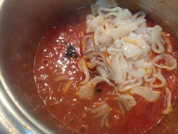 Añadir los calamares, una pizca de tinta de calamar, salar al gusto.