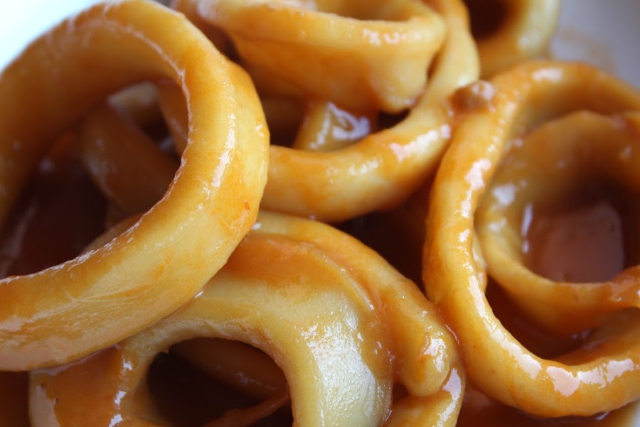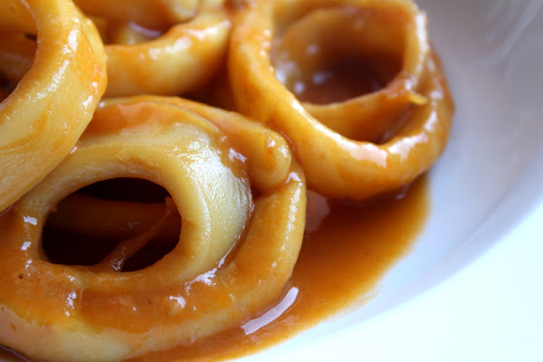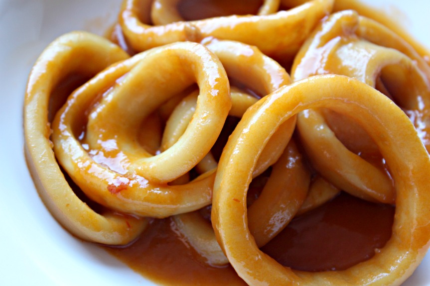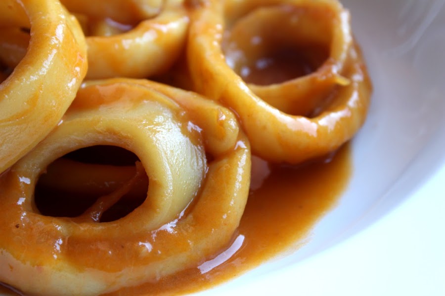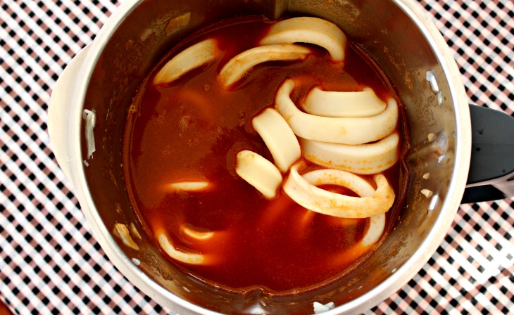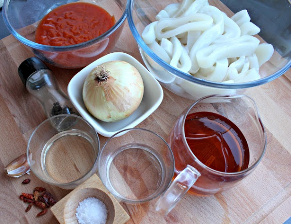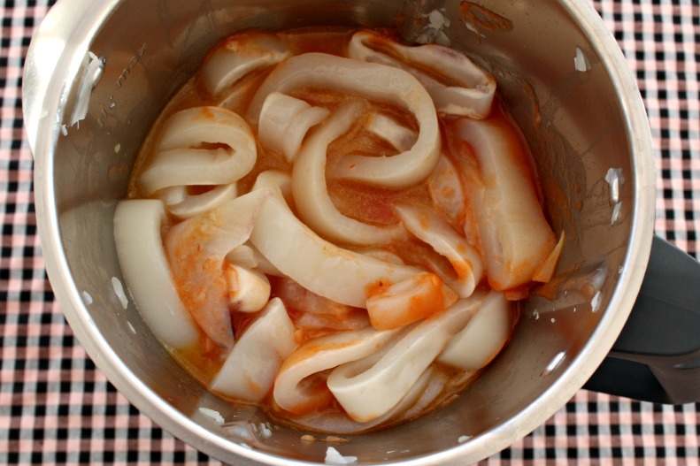 El agua, el vino, la salsa de tomate, los calamares, pellizco de sal y golpe de pimienta. Todo al vaso.