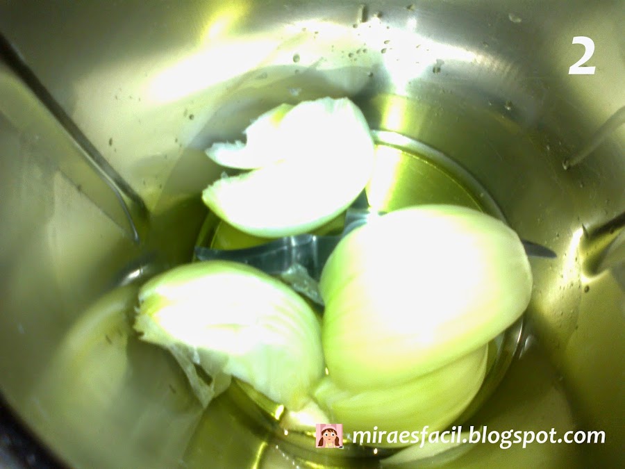 En el vaso de la thermomix, ponemos el aceite y el ajo.