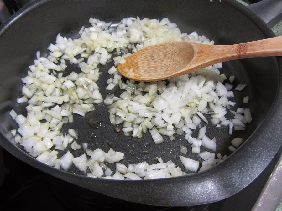 Pasados unos minutos, tapamos la cazuela, hasta que la cebolla quede blandita y tome algo de color.
