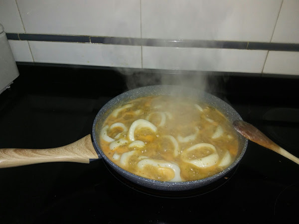 Bajamos el fuego y dejamos durante 25 minutos o hasta que los calamares estén tierno, añadimos el perejil bien picados y los langostinos, dejamos otro par de minutos o hasta que los langostinos adquieran un color rosado y ya están listos para sacarlos.