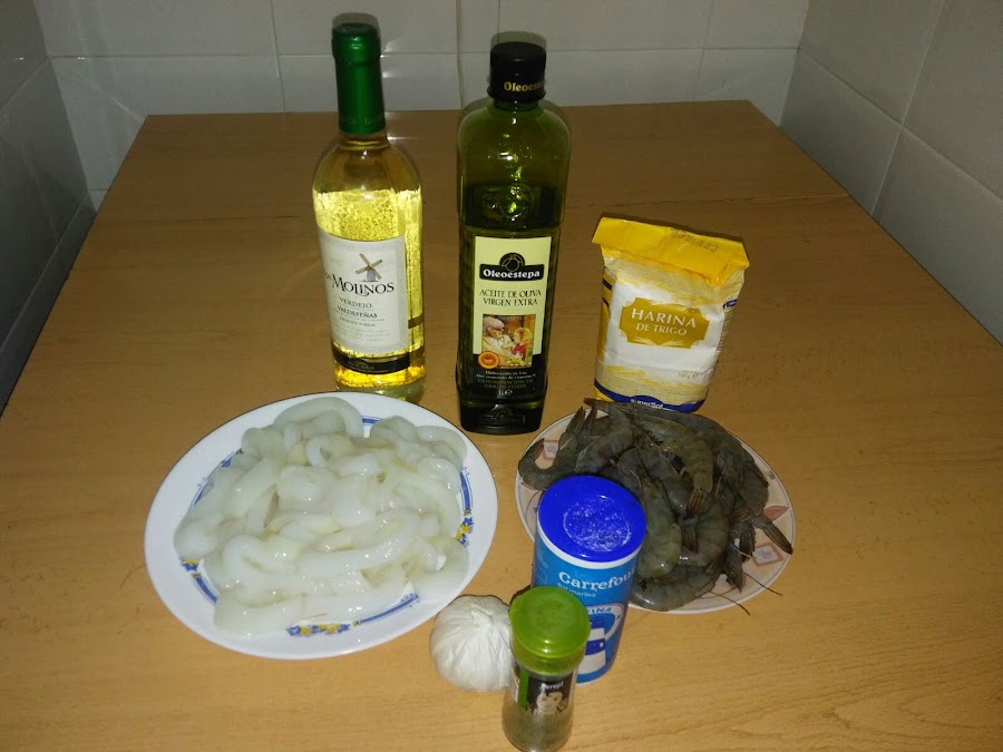 En una sartén echamos un chorro de aceite y ponemos a sofreír los ajos bien picaditos. Cuando estén dorados, echamos la cucharada de harina y le damos varias vueltas para se cocine. A continuación, añadimos los calamares, el medio vaso de vino y subimos el fuego para que se evapore el alcohol durante un par de minutos. Luego vamos agregando poco a poco el caldo que hemos preparado con las cáscaras de los langostinos y echamos un poco de sal y pimienta negra molida.