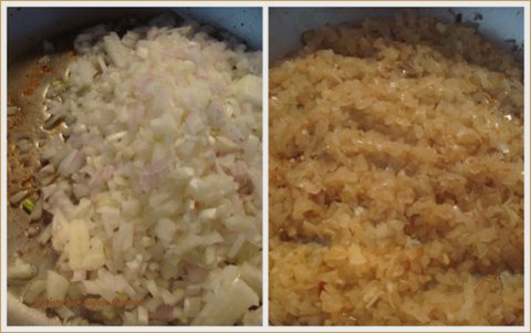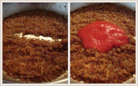 A la izquierda se puede ver el sofrito de cebolla sin una gota de líquido. Solo contiene la grasa que le aporta el aceite. Es el momento de añadir el tomate. Si tenéis un tomate frito casero, bien concentrado, también os sirve.