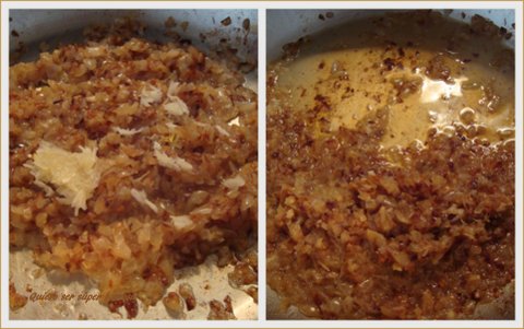 Confitar la cebolla lentamente. Cuando tome un color dorado, añadir el ajo machacado en el mortero. Cocinar hasta que empecéis a notar el olorcito que desprende el ajo pochado. No debe quedar crudo.