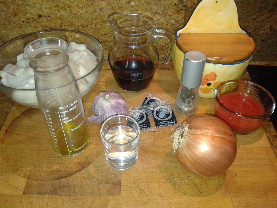 1 kg de anillas de calamar, 1 cebolla grande, 50 ml de aceite de oliva, 100 gr de tomate triturado (natural o en conserva), 3 bolsitas de tinta de calamar disueltas en un poco de agua, 1 dientes de ajo, 200 ml de brandy, 50 ml de agua, sal y pimienta.