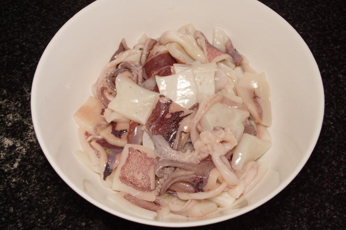 Limpiar bien los calamares (a veces los limpian en la pescadería), por dentro y por fuera, no es necesario quitarles la piel. Trocearlos en tacos no grandes, sazonamos y reservamos.
