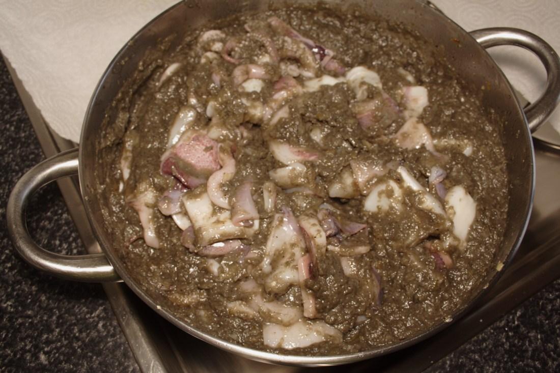 Dejamos unos minutos en el fuego y añadimos los calamares, al principio parece que queda muy espesa la salsa, pero los calamares sueltan algo de jugo.