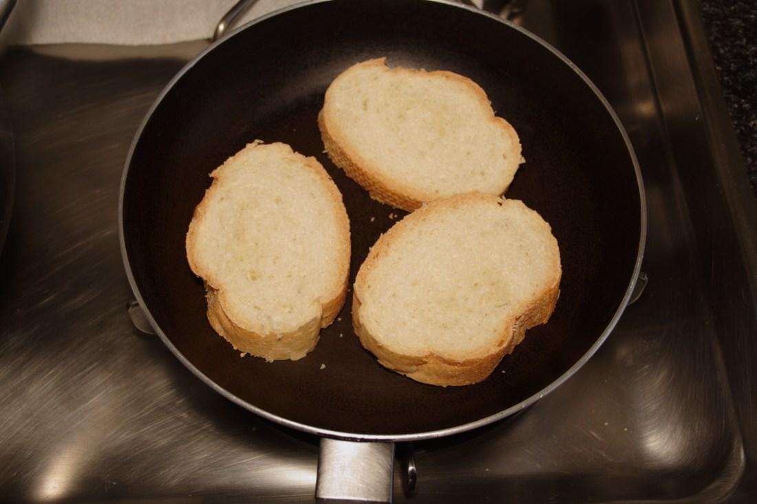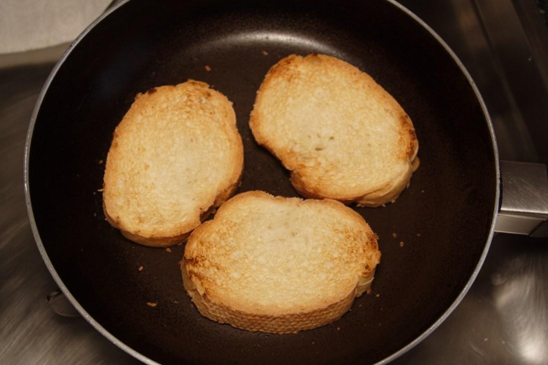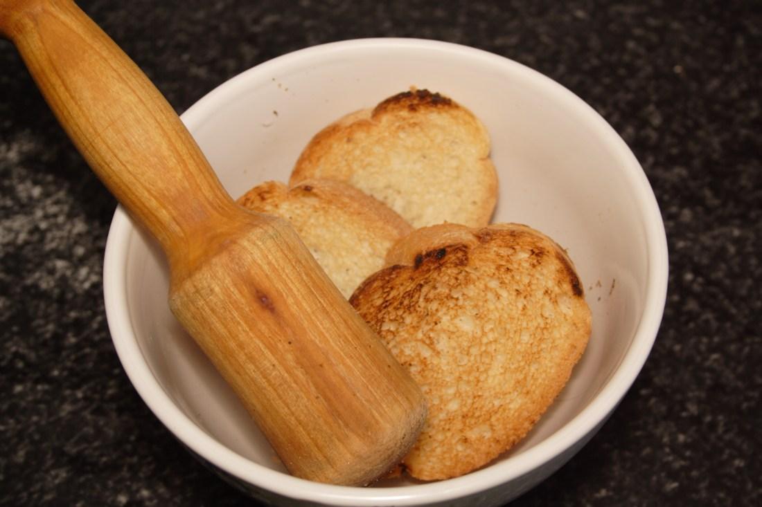 Mientras en una sartén bien caliente vamos tostando las rebanadas de pan, una vez tostadas al gusto, retiramos y las trituramos en un mortero, reservamos.