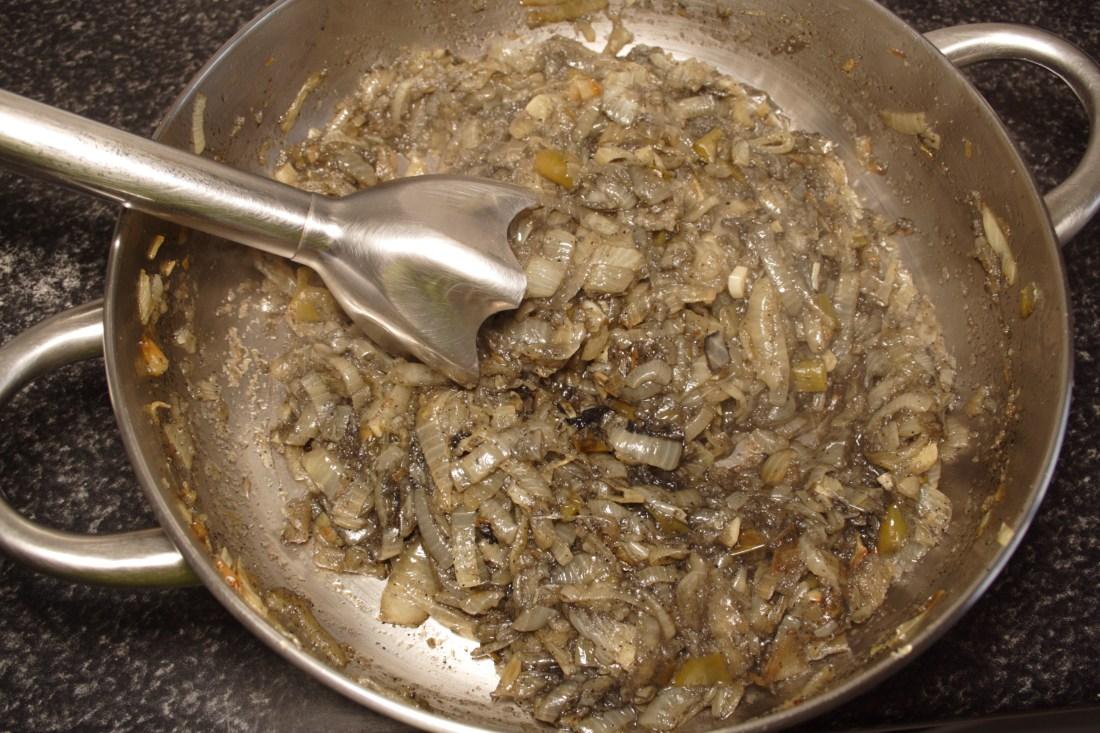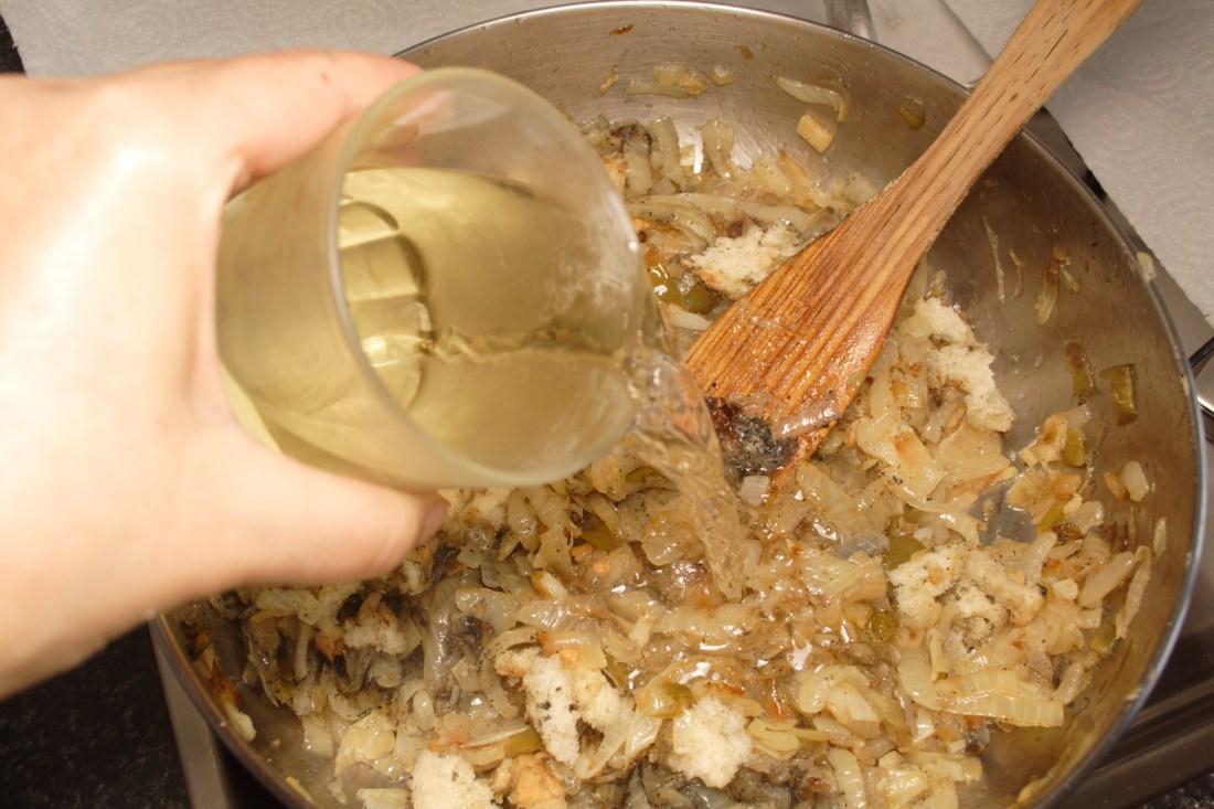 Incorporamos el vino blanco, removemos y trituramos con la batidora. Dará como resultado una salsa homogénea y ligada.