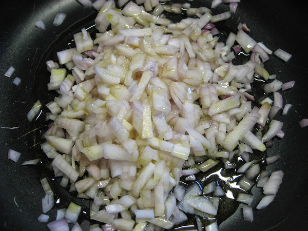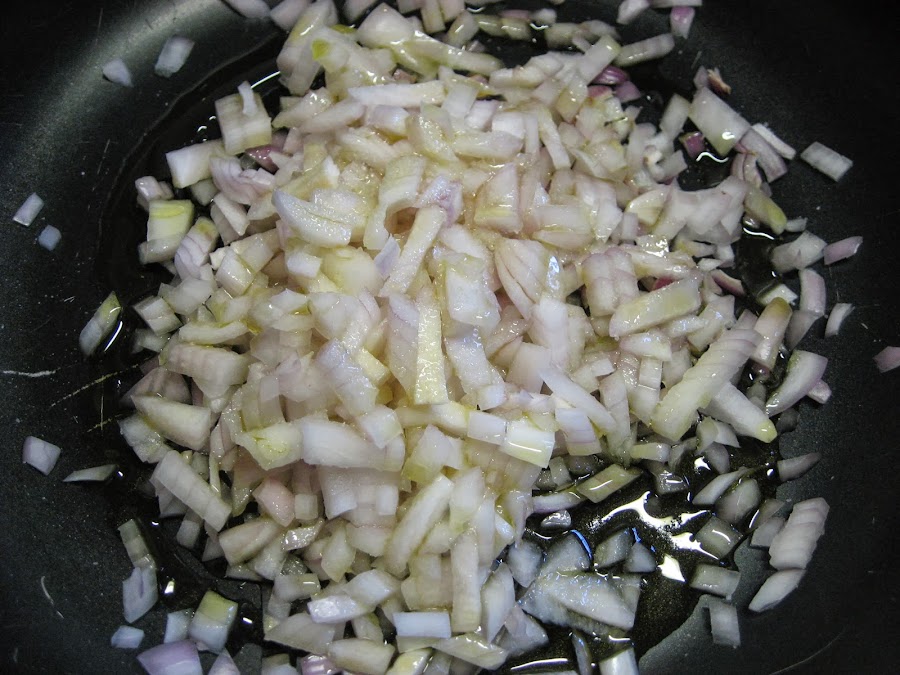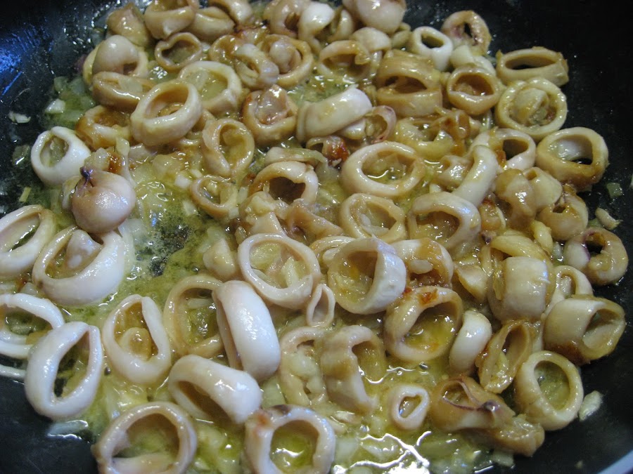 2º " Retiramos los calamares y añadimos la cebolla cortada a cuadraditos. Dejamos que se comience a dorar y retiramos la cazuela del fuego.