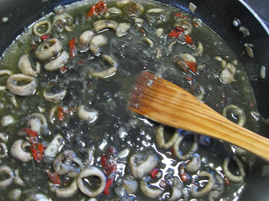 3º " Añadimos los calamares y el pimiento asado, le damos un par de vueltas y añadimos el vino junto a la tinta de los calamares. (Si no sabéis sacarle la tinta a los calamares tambien se venden bolsitas en el super y en algunos supermercados de congelados).