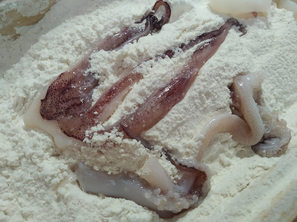 Enharinar las patas del calamar con harina de trigo fina y freirlas en abundante aceite de oliva virgen extra muy caliente hasta que esté dorada. Sacar, colocar sobre papel de cocina a fin de que absorba el aceite sobrante. Reservar.