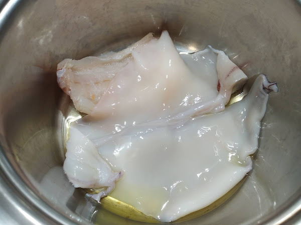 Cortar el cuerpo de calamar en trozos de unos cuatro centímetros de alto y con paciencia intentar retirar tanto del interior como del exterior una finísima telilla casi invisible que haría que con el calor la carne de contrajese. Y reservar.