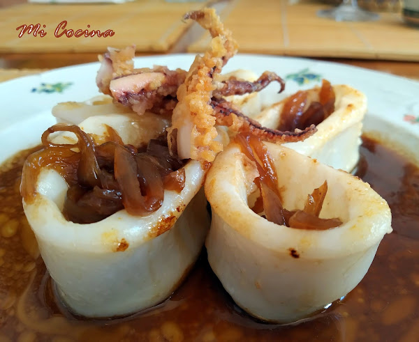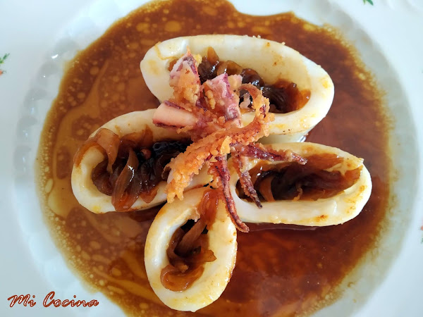 Colocar los trozos de calamar en el plato, rellenar con la cebolla y salsear al gusto, colocar encima las patas del calamar frita y servir de inmediato.