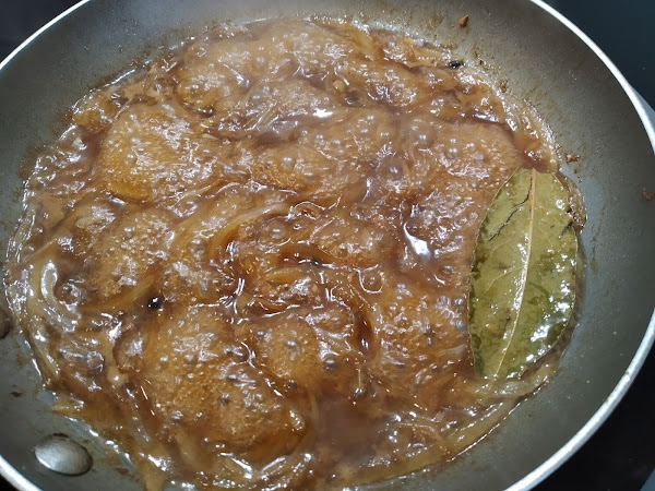 Incorporar un cucharón del caldo de pescado, salar al gusto y dejar cocer la cebolla a fuego medio hasta que el caldo se evapore por completo.