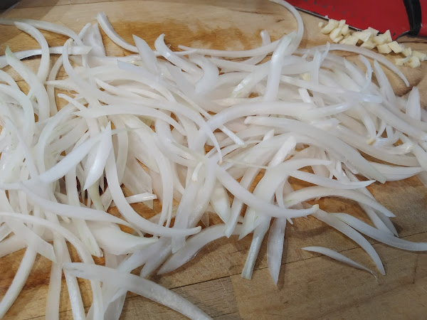 Pelar la cebolla y cortarla en juliana lo más fina posible, separando los trozos unos de otros. Pelar el diente de ajo, quitar la raíz central y cortar en trocitos pequeños.