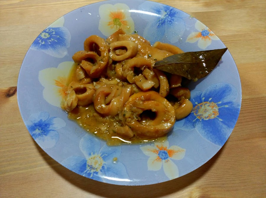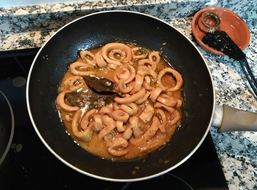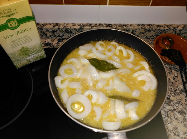 Al ratito añadimos una cucharadita de pimentón, la hoja de laurel, perejil y un buen chorreón de vino blanco, que las anillas queden cubiertas.