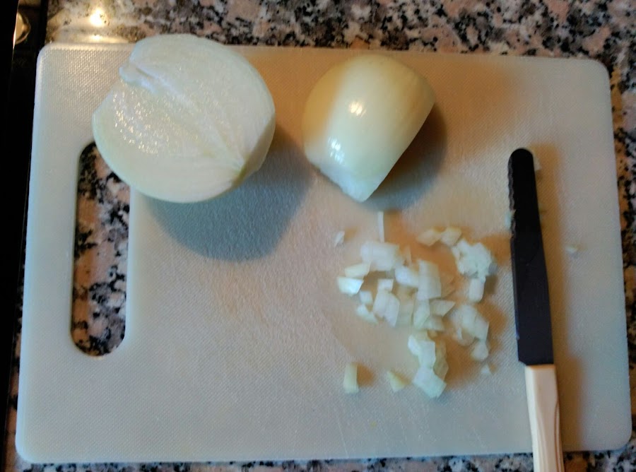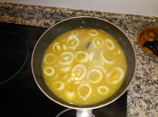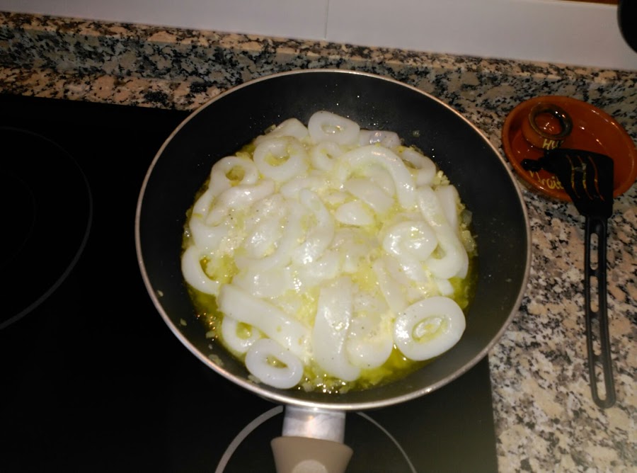 Los añadimos a una sartén con aceite caliente y cuando veamos que empiezan a pocharse, añadimos las anillas y salpimentamos.