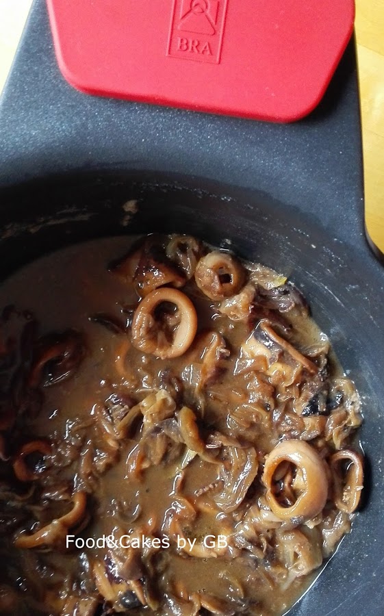 2. En este momento añadiremos las anillas de calamar, el fumet y el vino y taparemos de nuevo a fuego muy bajo hasta que al probar los calamares estén tiernos.
