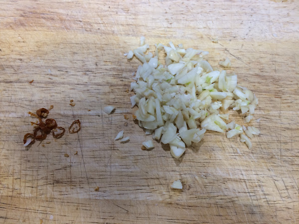 Pelamos y cortamos los dientes de ajo y también la guindilla eliminando toda la semilla.