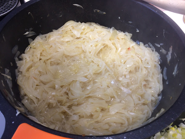 Pelamos y cortamos en juliana los 3 kg de cebolla, los ponemos en la cazuela y ahora reducimos la potencia del fuego a 4-9.
