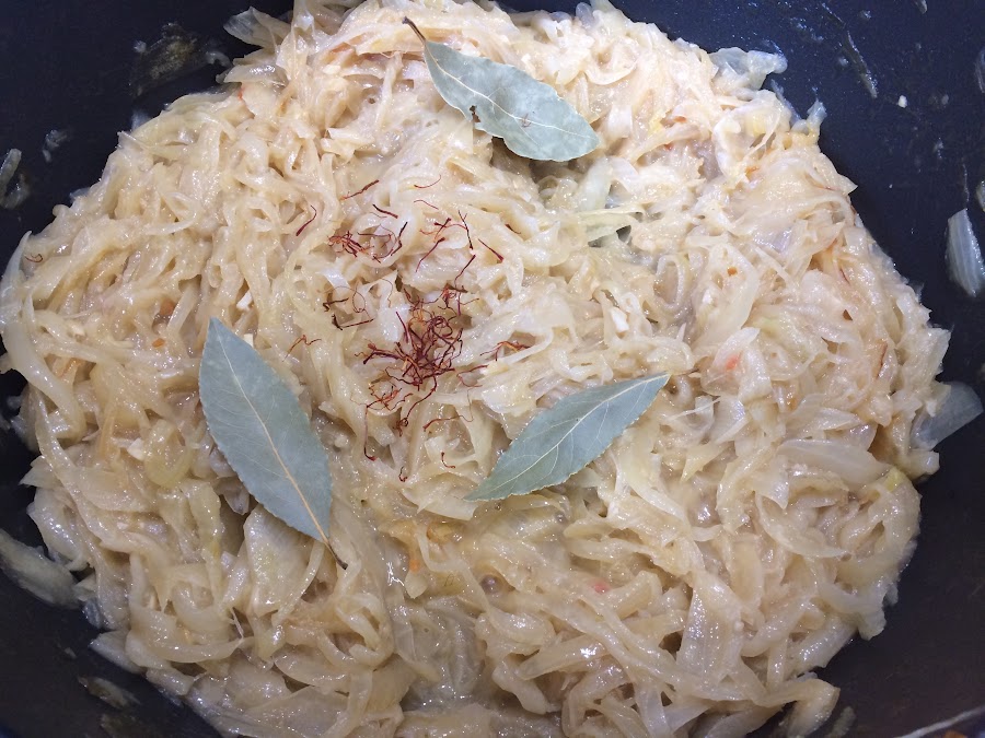 Ahora es el momento de incorporar el laurel y las hebras de azafrán, justo a la mitad del pochado.
