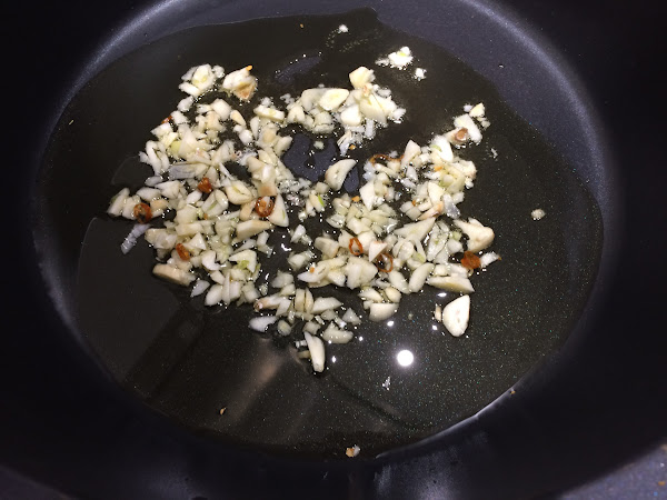 Doramos el ajo junto con la guindilla, mucho cuidado que no se nos queme, se nos tiene que dorar pero nunca quemar.