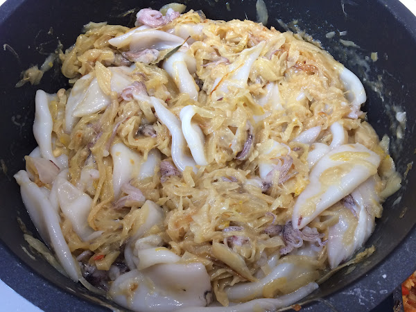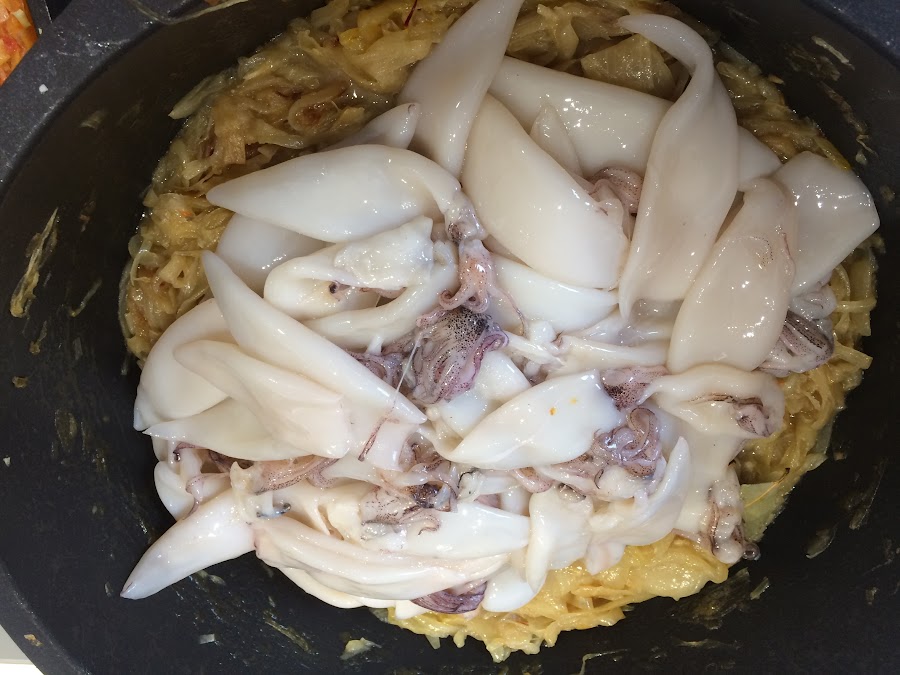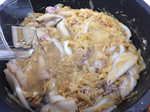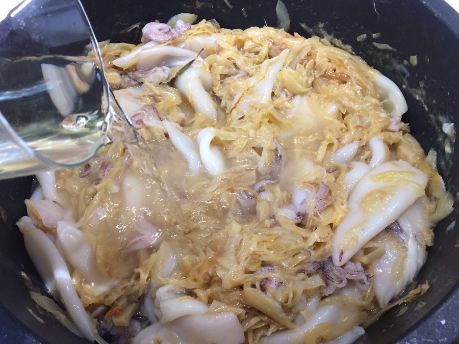 Añadimos los calamares a la cazuela.