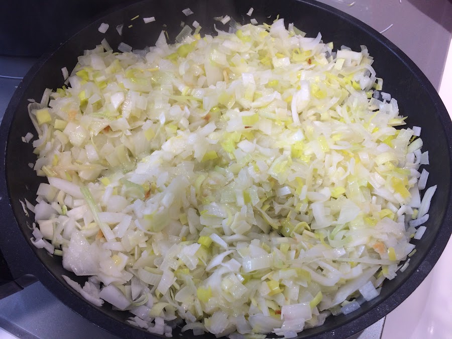Ahora es el momento de incorporar los 3 puerros cortados finos.