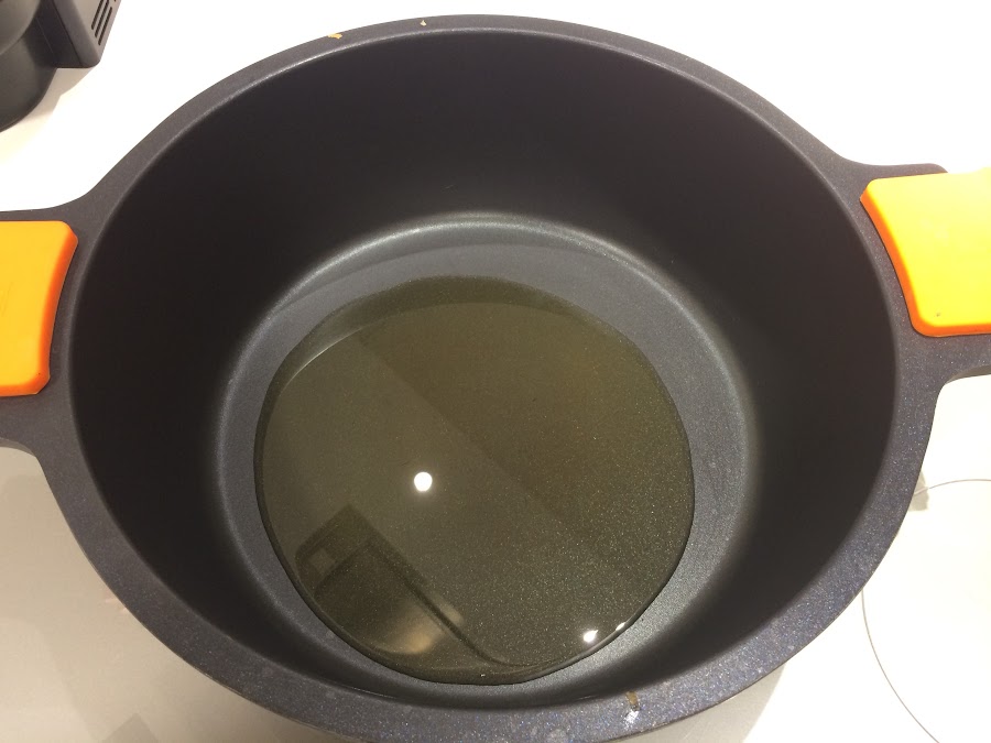En primer lugar colocamos una cazuela grande, ya que tenemos que pochar 3 kg de cebolla que no es poco. Calentamos el aceite.