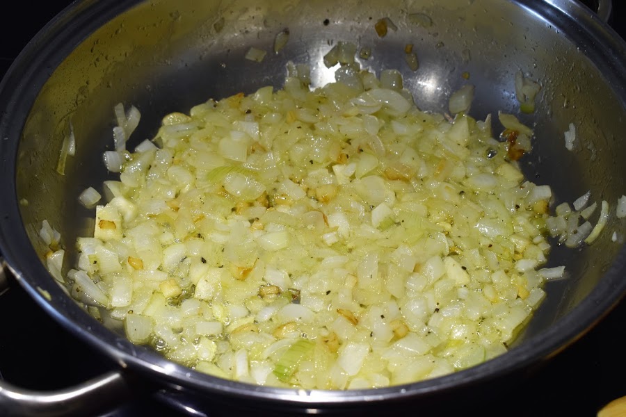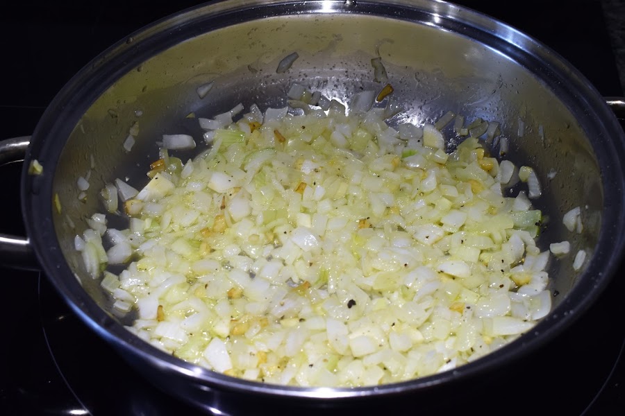Ponemos una cazuela con un poco de aceite y freímos los ajos y continuación echamos las cebollas, añadimos sal y pimienta.