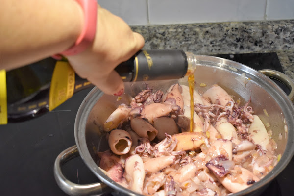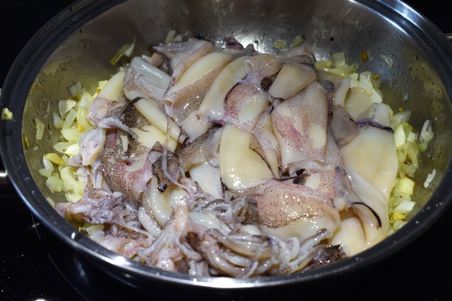 Añadimos los calamares y los vamos friéndolos.