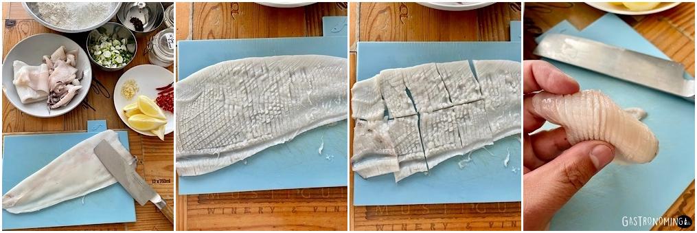 3. Si ya tenemos nuestro calamar limpio, lo secamos bien con papel absorbente y le hacemos cortes lineales en cruz por la parte interior solo marcando las líneas con un cuchillo bien afilado, pero sin llegar a cortar el calamar, solo marcas (ver foto) esto ya lo hicimos en otras preparaciones de calamar. Ahora lo cortamos en trozos de bocado.