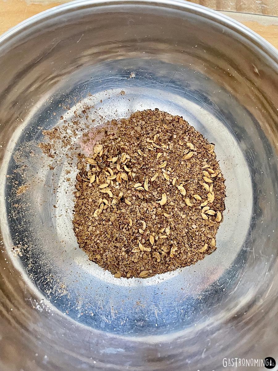 1. Ponemos el wok a fuego fuerte y vamos a tostar los granos de pimienta negra y la pimienta de Sichuan un par de minutos moviendo constantemente para que no se quemen y suelten toda su fragancia, lo notarás, créeme.2. Ponemos las pimientas tostadas en un mortero y añadimos la sal marina, trituramos bien. Ahora lo mezclamos con las cinco especias chinas y reservamos.