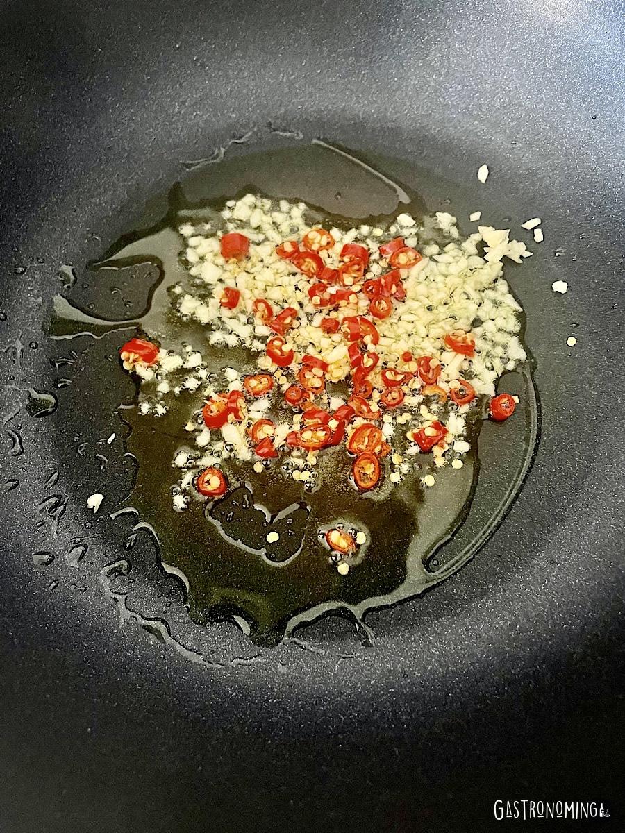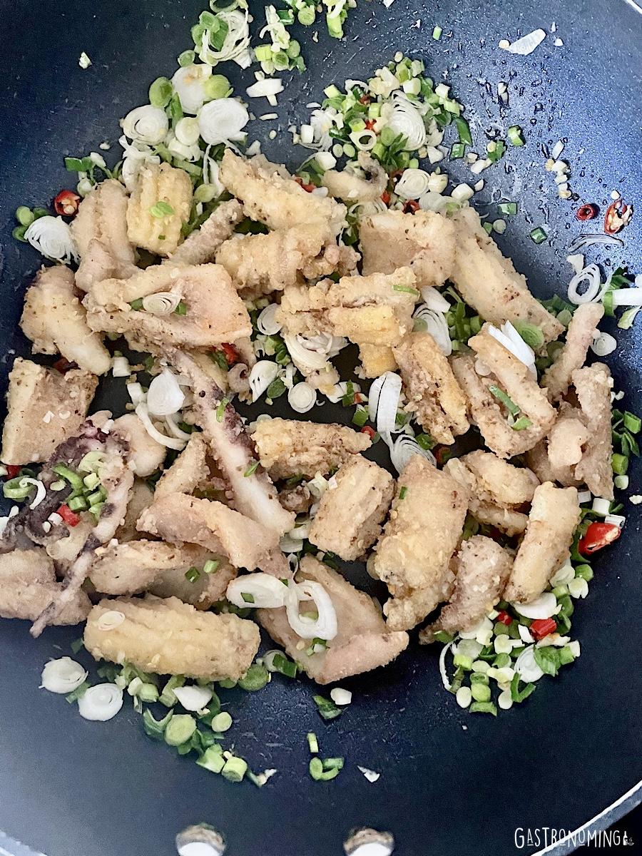 7. Ahora, en el wok a fuego medio alto, ponemos el aceite para cocinar y añadimos los ajos picados, los chiles y las cebolletas. Salteamos un minutos, añadimos los calamares y lo que queda de nuestra mezcla de especias.