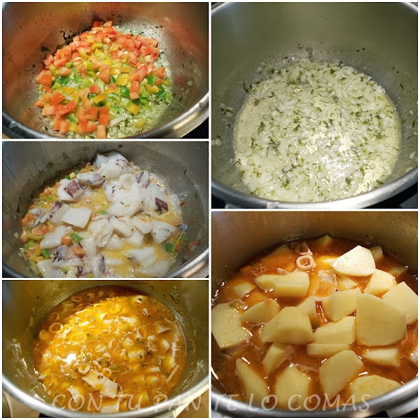 Pero existen los congelados, limpios y troceados y para el guisito de hoy me han venido de lujo, aunque los calamares reducen tanto su tamaño al cocinarlos que me daba miedo que desaparecieran. Pero no, ahí estaban, chiquititos... pero estaban. Merece la pena hacerlos en la olla a presión porque se hacen en unos minutos y quedan muy tiernos. Mi olla es del año la tos, así que el tiempo mejor que cada uno lo adapte a la suya.