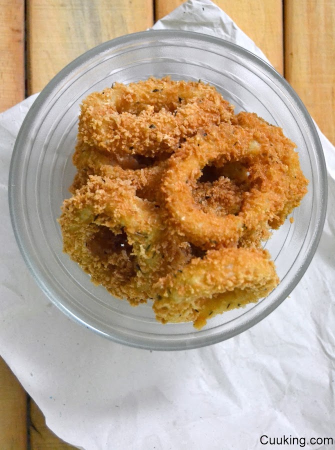 4.- Rebozamos las anillas. Las pasamos primero por harina, luego por huevo y finalmente por el ponko. Al rebozar por panko es importante apretar bien con las manos para que se adhiera una capa uniforme.