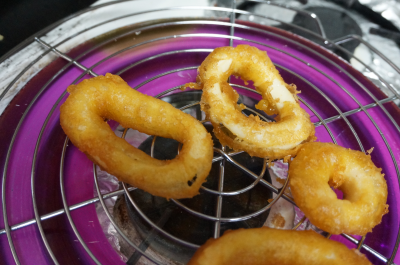 Tendremos preparado una rejilla encima de un plato. Cuando vayamos sacando los calamares los iremos poniendo en la rejilla para que suelten el aceite. (Si el aceite está bien caliente no cogen mucho aceite los calamares). De esta manera escurren y la masa no se ablanda y quedan crujiente.