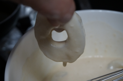 Una manera de saber si la masa está bien o necesita más harina es echar un calamar rebozado a freír, si cuando está frito el calamar sale el rebozado despegado o trozos sin rebozado como se ve en la foto uno de ellos, es que necesita más de harina. Entonces se puede ir echando una cucharada de harina, mezclar y volver a hacer la misma operación.