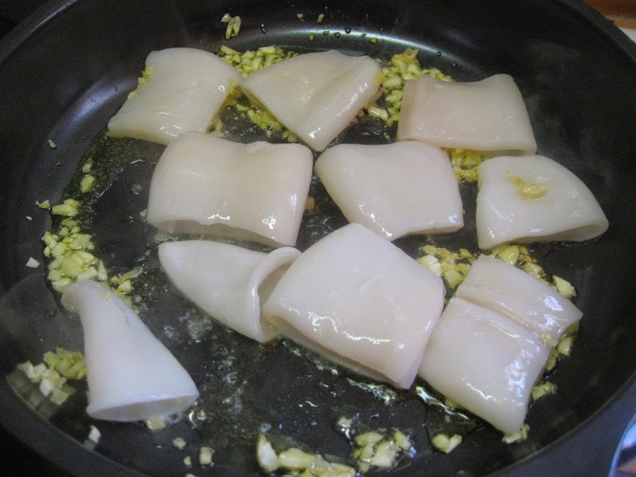 2º " Cortamos los ajos y ponemos la mitad en la sartén, seguidamente colocaremos los calamares cortados a trozos grandes (ver foto), los freímos y retiramos, reservamos.