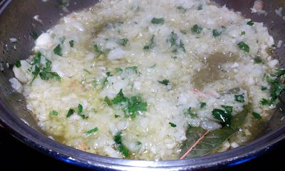 En una cacerola pon aceite a calentar, sofríe la picada anterior. Pon también la hoja de laurel cuando esté dorada la cebolla.