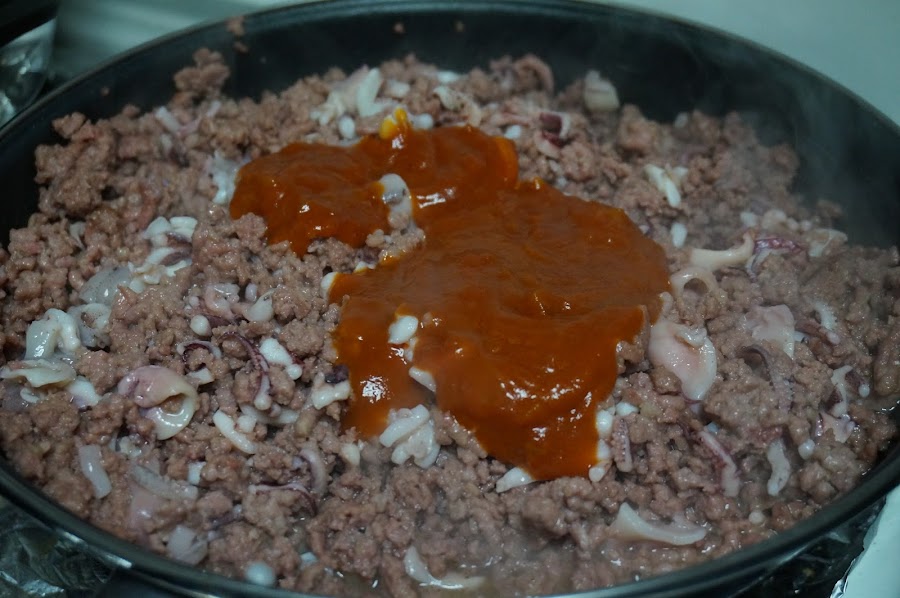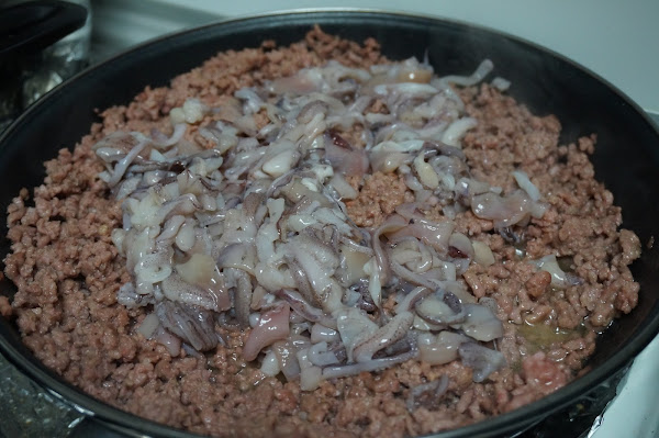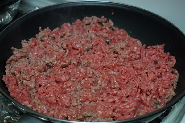 Ponemos una sartén con aceite y freímos la carne picada sazonada con un poco de sal y pimienta.