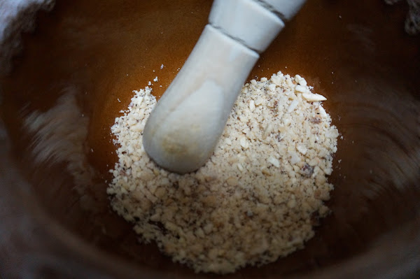 Lo dejamos cocinar unos 15 minutos , mientras en un mortero picaremos un puñadito de almendras y avellanas.